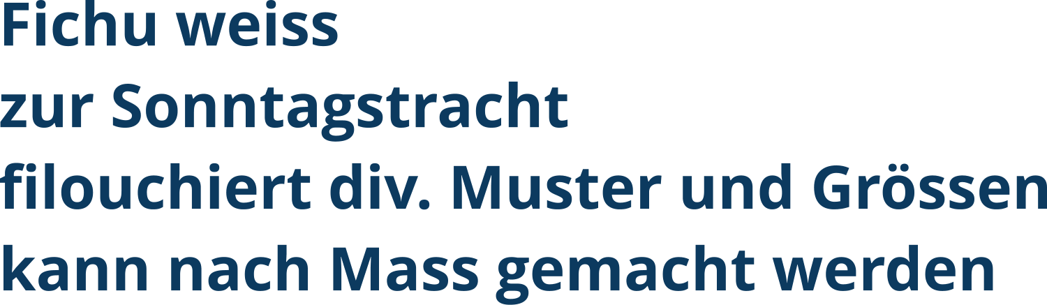 DamentrachtenschuheModell G und H   Gr. 36 bis Gr. 43 HerrentrachtenschuheGr. 39 bis Gr. 47 Geräteschuhe aus Lederfür die Tanzproben Herren TrachtenhutGr. 55 bis Gr. 61 Kravättli / Masche / Jodlerknopf Trachtenhütezur Kinder/ Sonntags und Festtagstracht Stulpen weisszur Sonntagstracht in Wolle oder Baumwolle  mit diversen Muster,kann auch nach Mass gestrickt werden Stulpen schwarzzur Festtagstracht in Wolle oder Baumwolle mit diversen Muster,kann auch nach Mass gestrickt werden Fichu gestricktzur Werktagstrachtdiv. Muster und Grössenkann nach Mass gemacht werden Rund um d’Tracht ● Anna Erni-Lichtin ● Ruswilstrasse 1 ● 6016 Hellbühl ● 041 495 28 58 ● info@rund-um-dtracht.ch